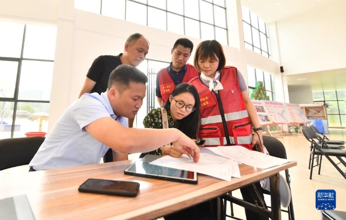 2022年5月6日,廣西柳州市融安縣大坡鄉(xiāng)崗偉村駐村第一書記黃晨暉(后排右)和鄉(xiāng)鎮(zhèn)干部、工程設(shè)計(jì)人員在大坡飛雞農(nóng)特產(chǎn)品大數(shù)據(jù)中心討論崗偉村產(chǎn)業(yè)示范帶方案。新華社記者 黃孝邦 攝