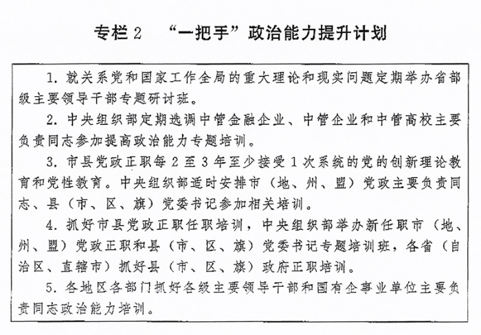 (二)突出“關(guān)鍵少數(shù)”政治訓(xùn)練。堅(jiān)持把政治訓(xùn)練貫穿干部成長(zhǎng)全周期,使干部的政治素養(yǎng)、政治能力與擔(dān)負(fù)的領(lǐng)導(dǎo)職責(zé)相匹配。強(qiáng)化“一把手”政治培訓(xùn),有計(jì)劃地選調(diào)地方、部門、國(guó)有企事業(yè)單位主要負(fù)責(zé)同志到黨校(行政學(xué)院)、干部學(xué)院參加專題培訓(xùn)。實(shí)施“一把手”政治能力提升計(jì)劃(專欄2)。省(自治區(qū)、直轄市)、市(地、州、盟)、縣(市、區(qū)、旗)黨政領(lǐng)導(dǎo)班子成員每2至3年到黨校(行政學(xué)院)、干部學(xué)院至少接受1次系統(tǒng)的黨的創(chuàng)新理論教育和黨性教育,5年內(nèi)累計(jì)不少于2個(gè)月。圍繞提高政治能力和領(lǐng)導(dǎo)能力,加強(qiáng)機(jī)關(guān)司局長(zhǎng)、處長(zhǎng)任職培訓(xùn)。重視對(duì)女干部、少數(shù)民族干部、黨外干部等的政治培訓(xùn)。加強(qiáng)對(duì)高層次人才的政治引領(lǐng),中央組織部會(huì)同有關(guān)單位每年組織一定數(shù)量人才開(kāi)展國(guó)情研修。