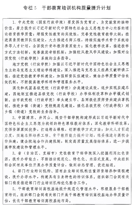 (一)培訓(xùn)機(jī)構(gòu)建設(shè)。推進(jìn)各級(jí)黨校(行政學(xué)院)建設(shè),以教學(xué)督導(dǎo)、師資培養(yǎng)、質(zhì)量評(píng)估為重點(diǎn),強(qiáng)化上級(jí)黨校(行政學(xué)院)對(duì)下級(jí)黨校(行政學(xué)院)的業(yè)務(wù)指導(dǎo),不斷提高辦學(xué)水平。推進(jìn)縣級(jí)黨校(行政學(xué)校)分類建設(shè)。加強(qiáng)社會(huì)主義學(xué)院建設(shè)。進(jìn)一步提升部門行業(yè)培訓(xùn)機(jī)構(gòu)、國(guó)有企業(yè)培訓(xùn)機(jī)構(gòu)辦學(xué)質(zhì)量。加強(qiáng)對(duì)干部教育培訓(xùn)高校基地、基層干部教育培訓(xùn)機(jī)構(gòu)辦學(xué)指導(dǎo)。開(kāi)展黨校(行政學(xué)院)、省(自治區(qū)、直轄市)黨性教育干部學(xué)院、干部教育培訓(xùn)高校基地辦學(xué)質(zhì)量評(píng)估。加強(qiáng)各類黨員干部教育培訓(xùn)機(jī)構(gòu)規(guī)范管理,嚴(yán)控新設(shè)以黨員干部為培訓(xùn)對(duì)象的培訓(xùn)機(jī)構(gòu)。支持地方、部門聯(lián)合開(kāi)展培訓(xùn),鼓勵(lì)干部教育培訓(xùn)機(jī)構(gòu)開(kāi)展區(qū)域協(xié)作交流,推動(dòng)優(yōu)質(zhì)培訓(xùn)資源共享。實(shí)施干部教育培訓(xùn)機(jī)構(gòu)質(zhì)量提升計(jì)劃(專欄5)。